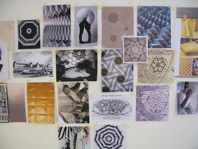 I am fascinated by surface, texture and light. Light from inside, light from behind, the way light alters and plays with surface, reflection and refraction, light and shadow. I will experiment with surface on the inside and outside by scoring pleating, folding and distressing papers with different thicknesses and transparencies. I will build paper maquette structures, photographing from above and beneath, playing with the idea of inside and outside. I will experiment further with trapping light within these objects to project pattern onto other surfaces playing with the idea of containment. I will be referencing geometric patterns, origami paper folding artists and the recent exhibition of Louise Borgeouis.